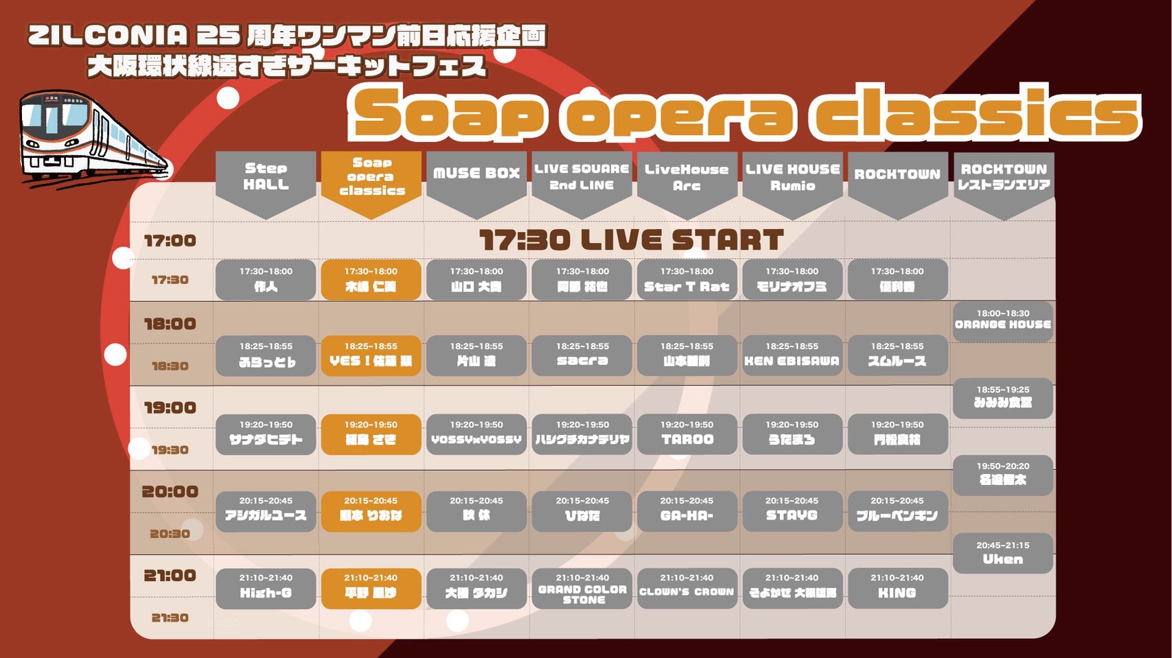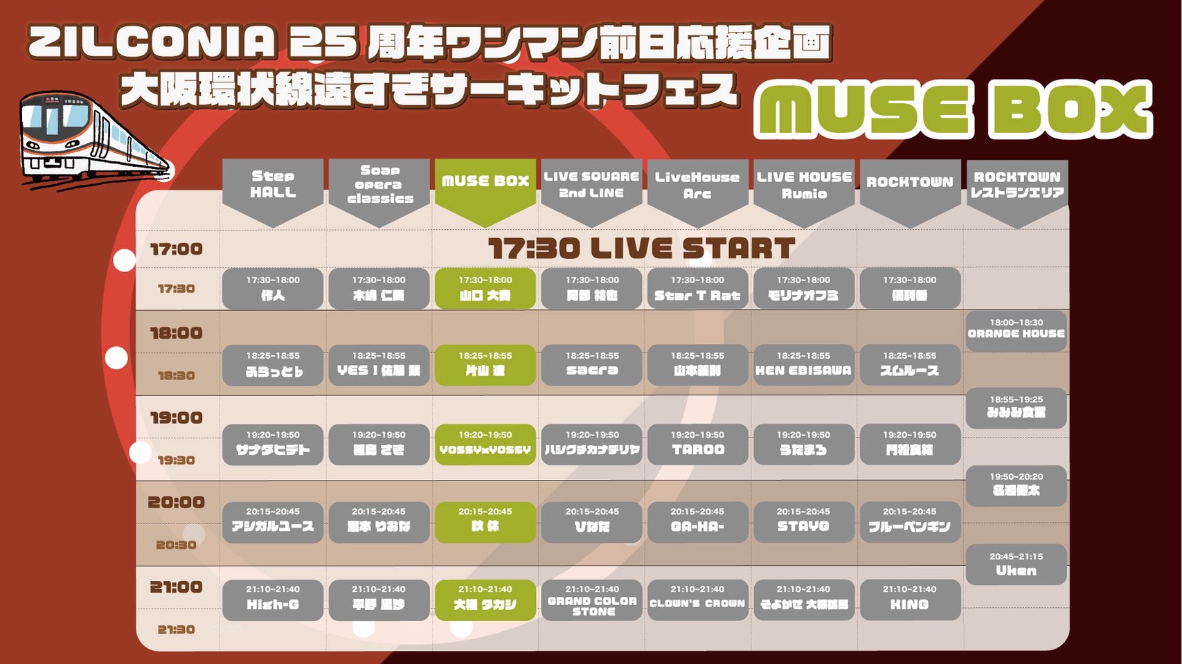 秋休 / アシガルユース / 阿部祐也 / YES!佐藤栞 / うたまろ / 植島さき / 大橋タカシ / ORANGE HOUSE / 片山遼 / 門松良祐 / GA-HA- / 木嶋仁美 / KING / CLOWN’S CROWN / GRAND COLOR STONE / KEN EBISAWA / 作人 / sacra / サナダヒデト / Star T Rat / STAYG / スムルース / そよかぜ大根雄馬 / 瀧本りおな / TAROO / 名迫僚太 / High-G / ハシグチカナデリヤ / ひなた / 平野里沙 / ふらっと♭ / ブルーペンギン / みみみ食堂 / モリナオフミ / 山口大貴 / 山本義則 / Uken / 優利香 / YOSSYxYOSSY